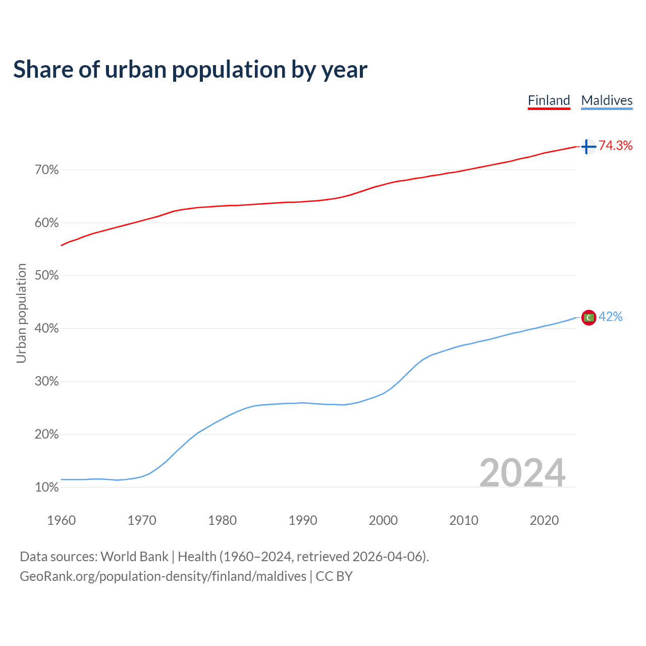 From 2004 to 2024, the share of urban population changed from 68.3% to 74.3% in Finland and from 32.9% to 42% in Maldives.