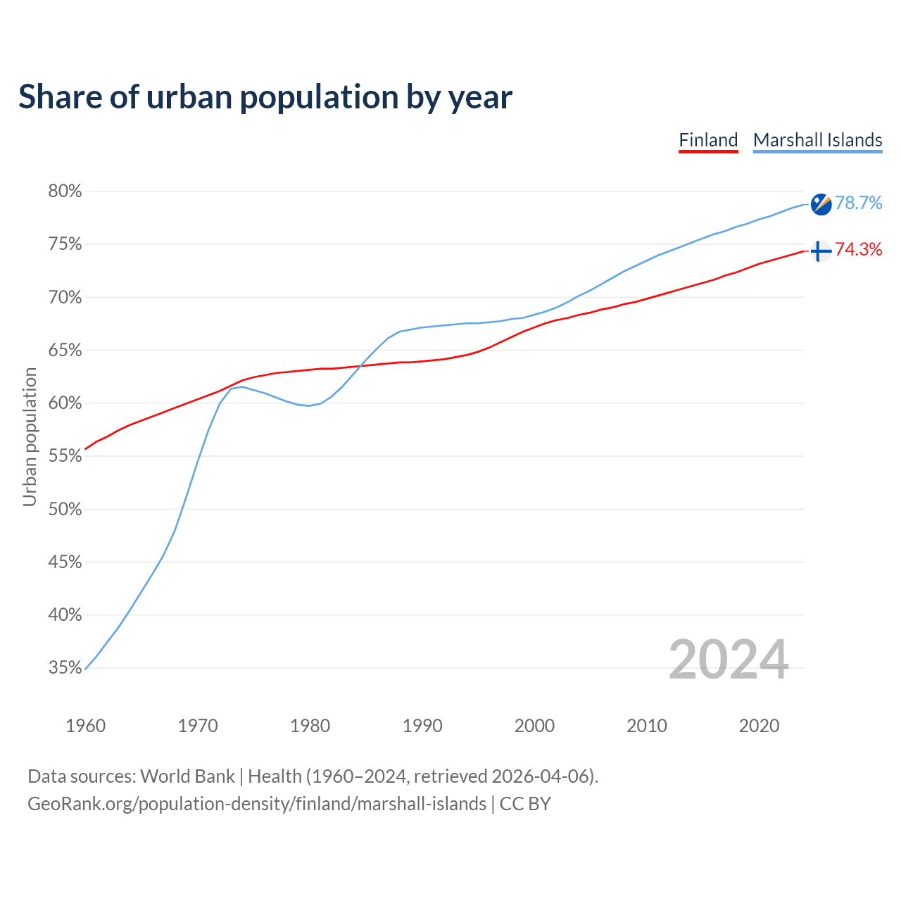 From 2004 to 2024, the share of urban population changed from 68.3% to 74.3% in Finland and from 70.1% to 78.7% in the Marshall Islands.