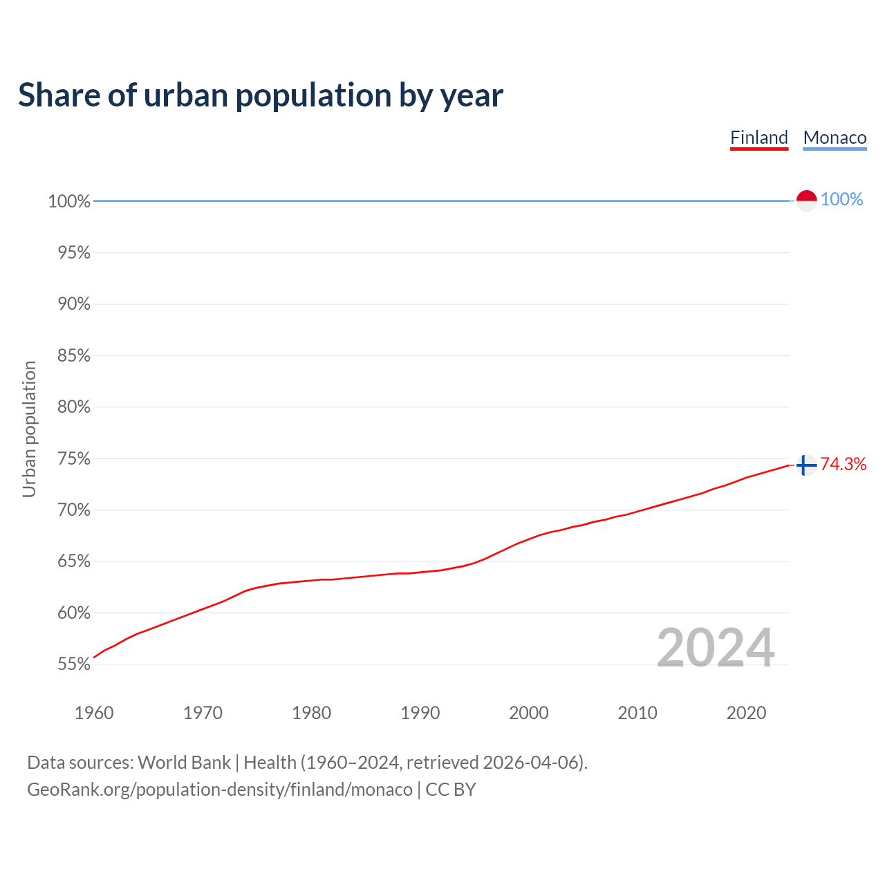 From 2004 to 2024, the share of urban population changed from 68.3% to 74.3% in Finland and from 100% to 100% in Monaco.