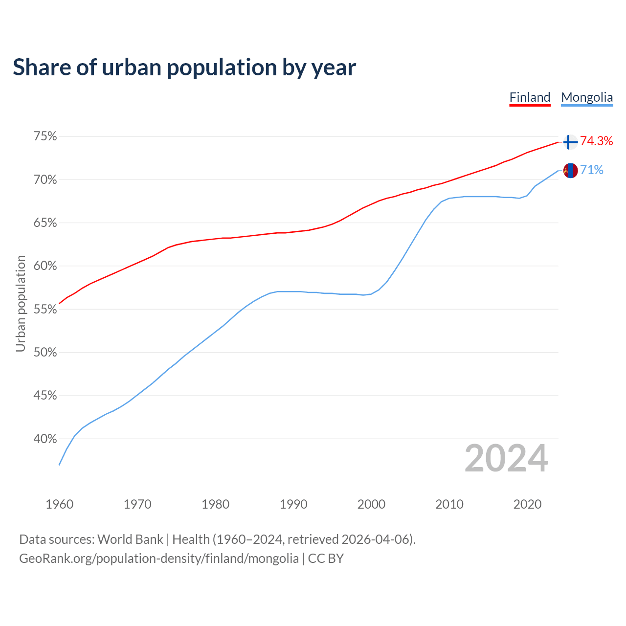 From 2004 to 2024, the share of urban population changed from 68.3% to 74.3% in Finland and from 60.8% to 71% in Mongolia.