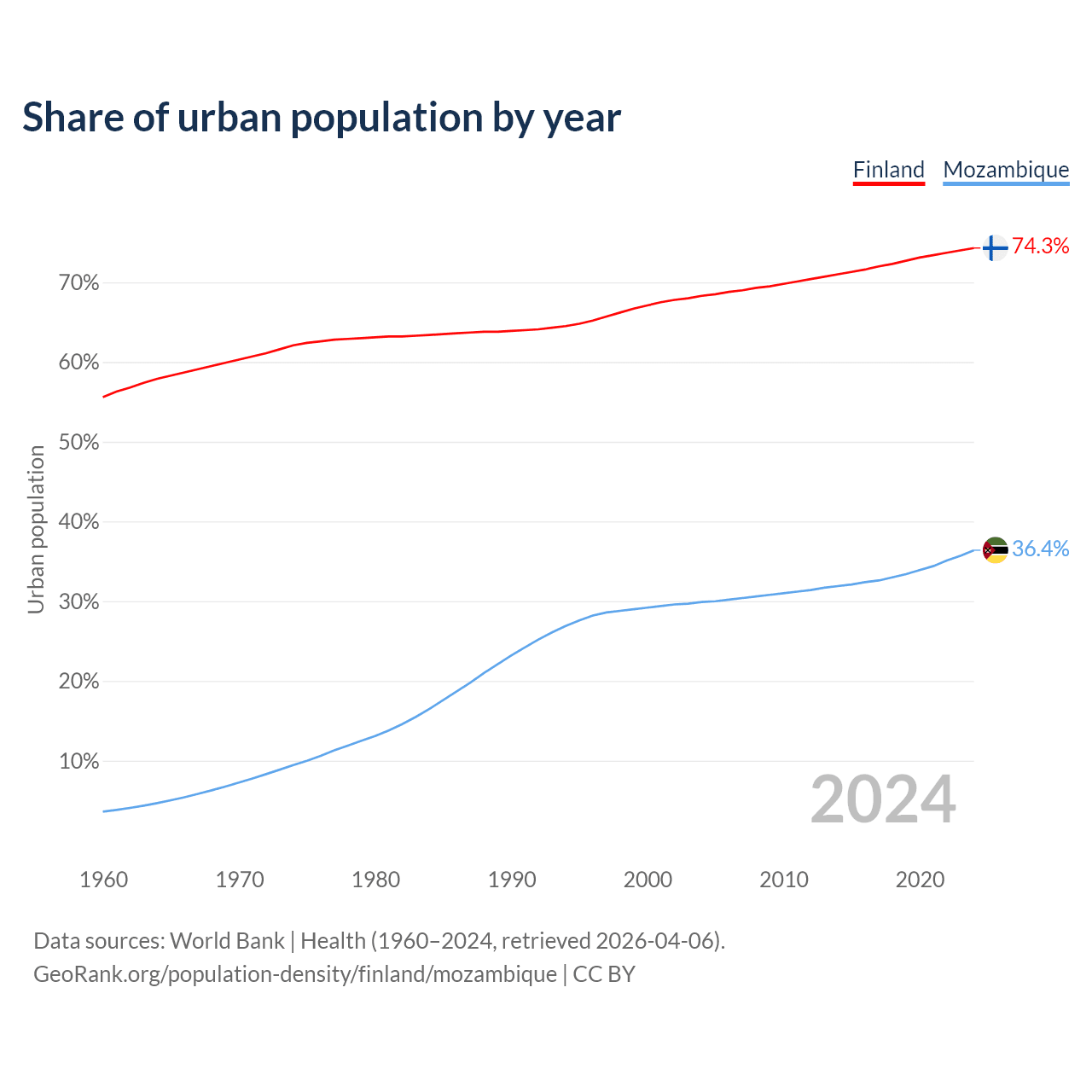 From 2004 to 2024, the share of urban population changed from 68.3% to 74.3% in Finland and from 29.9% to 36.4% in Mozambique.