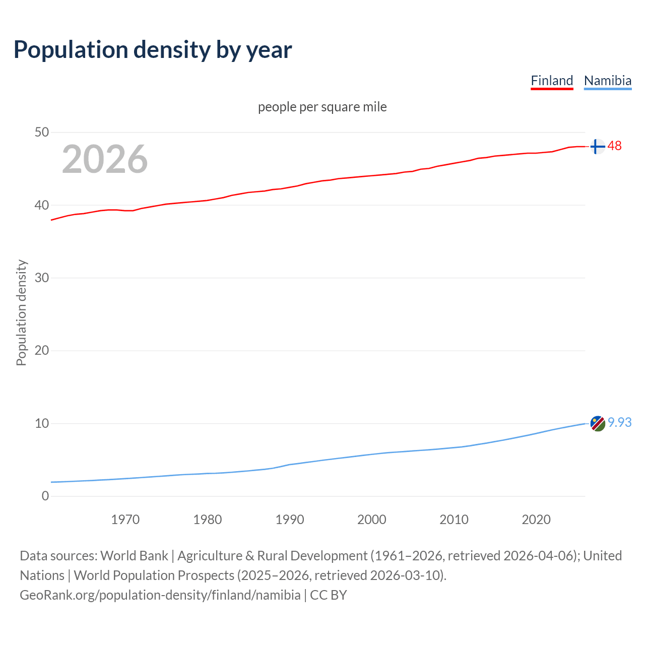 From 2006 to 2026, population density in Finland increased by 7%, compared to a 58.5% growth in Namibia.