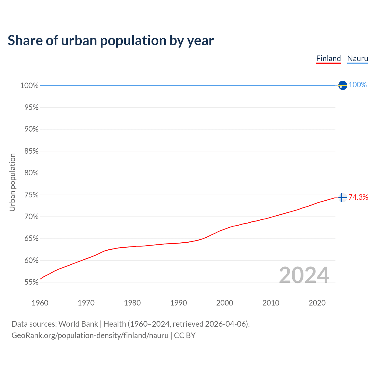 From 2004 to 2024, the share of urban population changed from 68.3% to 74.3% in Finland and from 100% to 100% in Nauru.