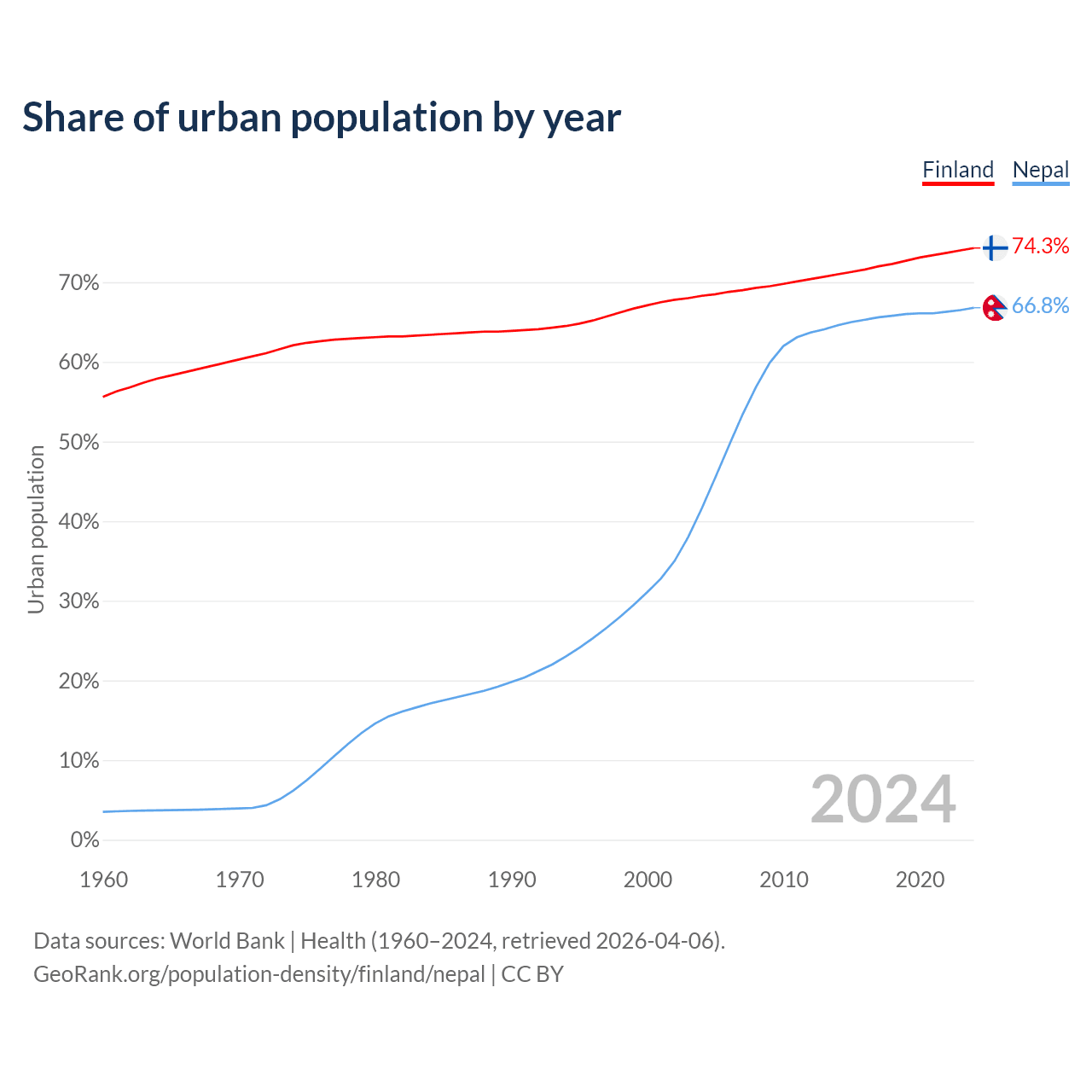 From 2004 to 2024, the share of urban population changed from 68.3% to 74.3% in Finland and from 41.6% to 66.8% in Nepal.