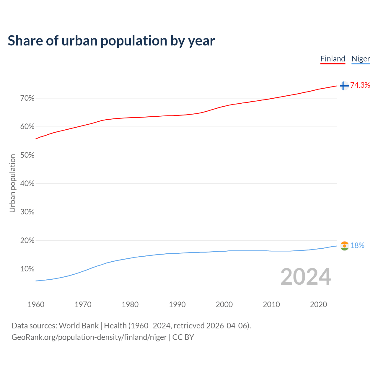 From 2004 to 2024, the share of urban population changed from 68.3% to 74.3% in Finland and from 16.3% to 18% in Niger.