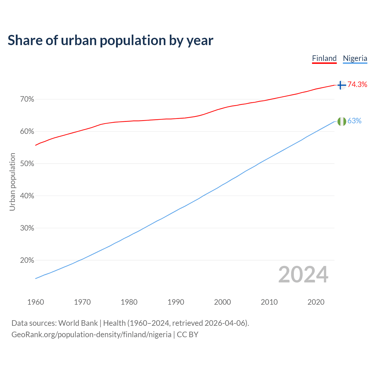 From 2004 to 2024, the share of urban population changed from 68.3% to 74.3% in Finland and from 46.7% to 63% in Nigeria.