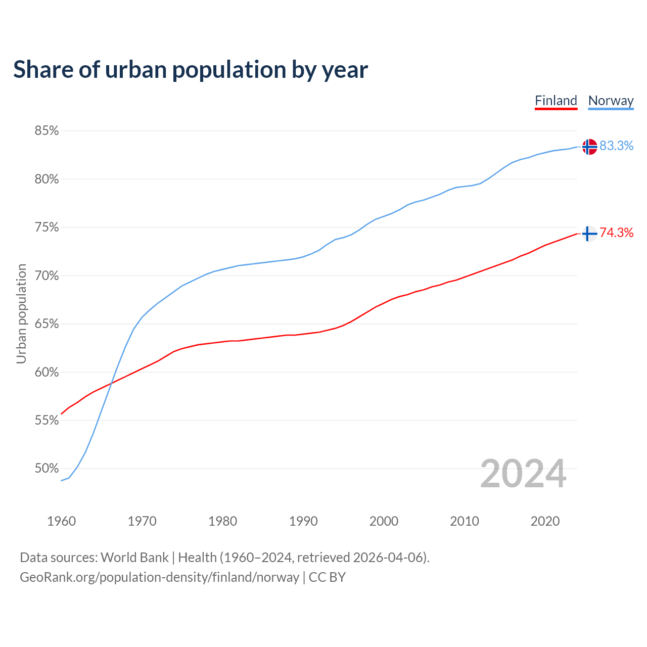 From 2004 to 2024, the share of urban population changed from 68.3% to 74.3% in Finland and from 77.6% to 83.3% in Norway.
