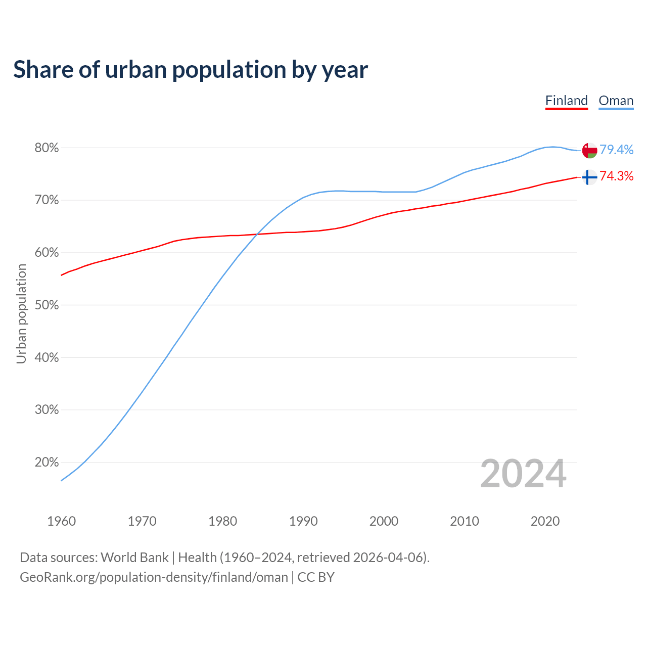 From 2004 to 2024, the share of urban population changed from 68.3% to 74.3% in Finland and from 71.5% to 79.4% in Oman.