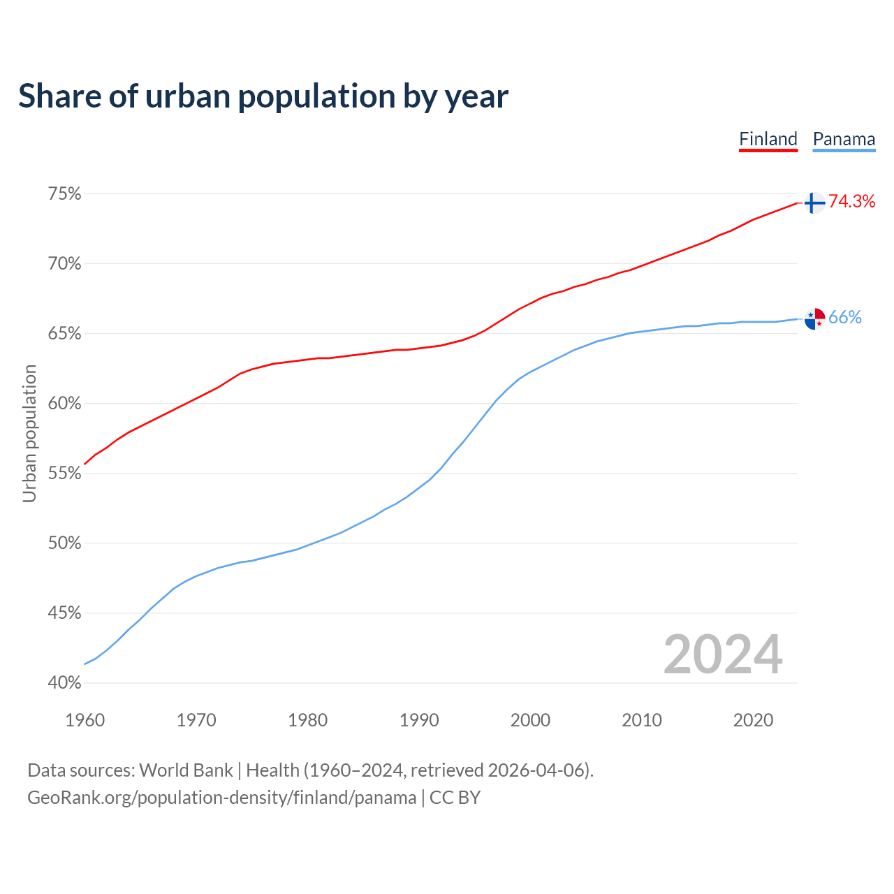From 2004 to 2024, the share of urban population changed from 68.3% to 74.3% in Finland and from 63.8% to 66% in Panama.