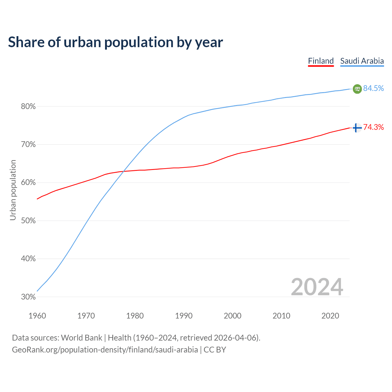 From 2004 to 2024, the share of urban population changed from 68.3% to 74.3% in Finland and from 80.8% to 84.5% in Saudi Arabia.