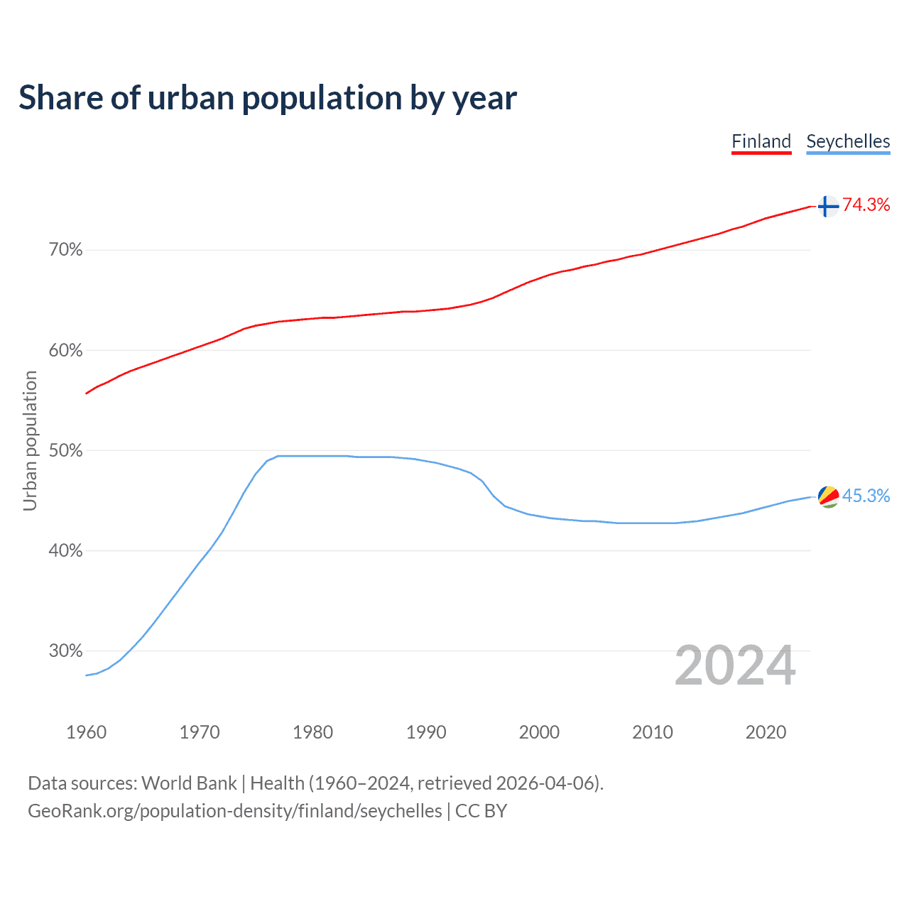 From 2004 to 2024, the share of urban population changed from 68.3% to 74.3% in Finland and from 42.9% to 45.3% in the Seychelles.