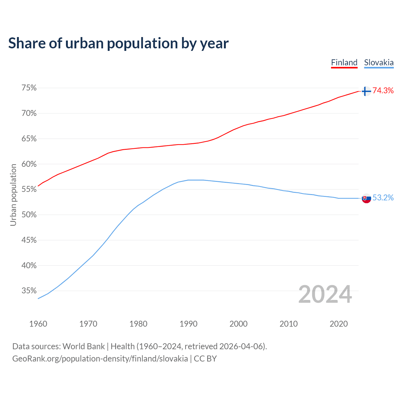 From 2004 to 2024, the share of urban population changed from 68.3% to 74.3% in Finland and from 55.6% to 53.2% in Slovakia.