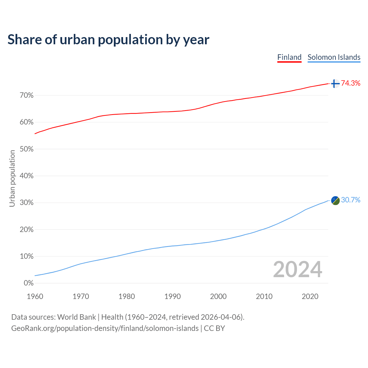 From 2004 to 2024, the share of urban population changed from 68.3% to 74.3% in Finland and from 17.2% to 30.7% in the Solomon Islands.