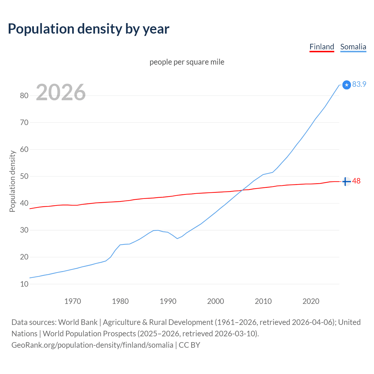 From 2006 to 2026, population density in Finland increased by 7%, compared to a 85.2% growth in Somalia.