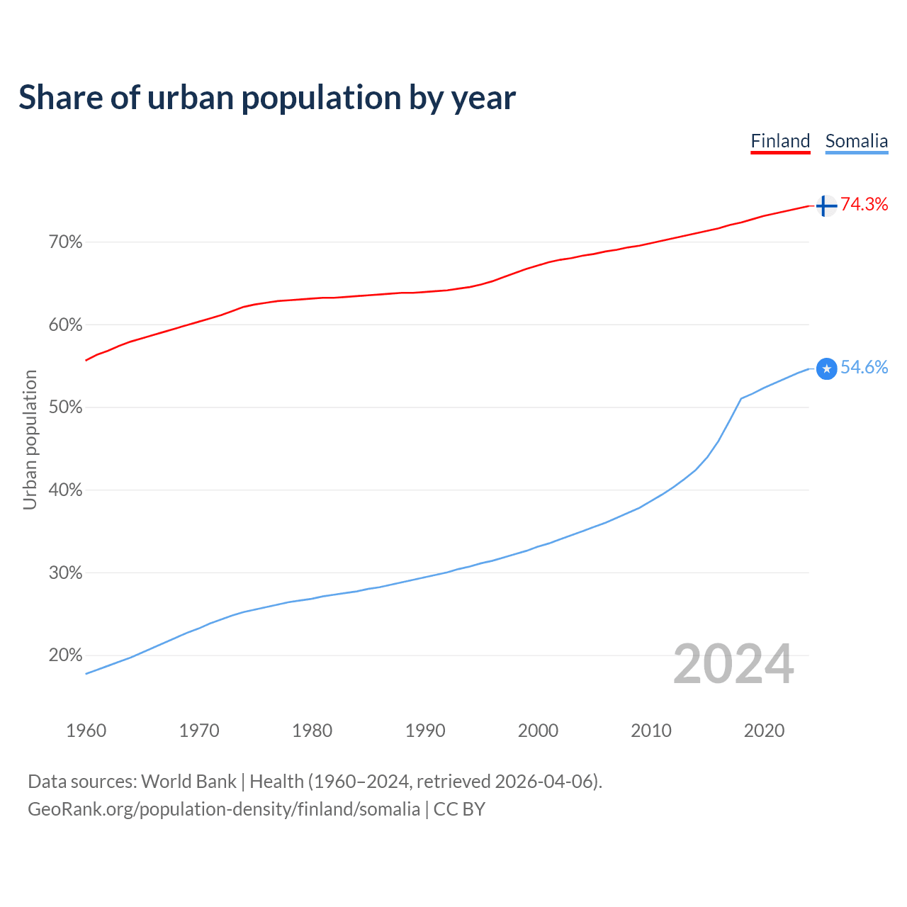From 2004 to 2024, the share of urban population changed from 68.3% to 74.3% in Finland and from 35% to 54.6% in Somalia.