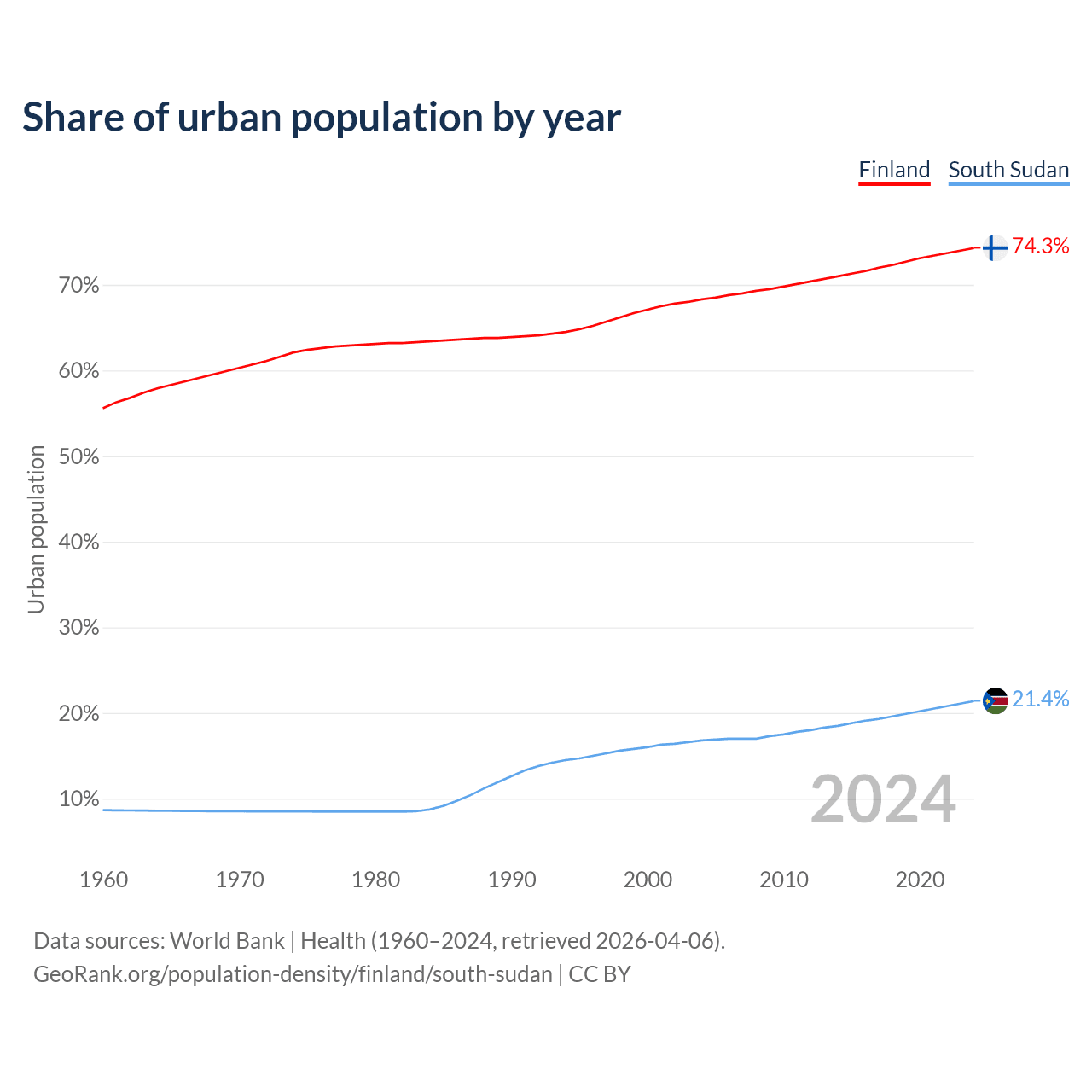 From 2004 to 2024, the share of urban population changed from 68.3% to 74.3% in Finland and from 16.8% to 21.4% in South Sudan.