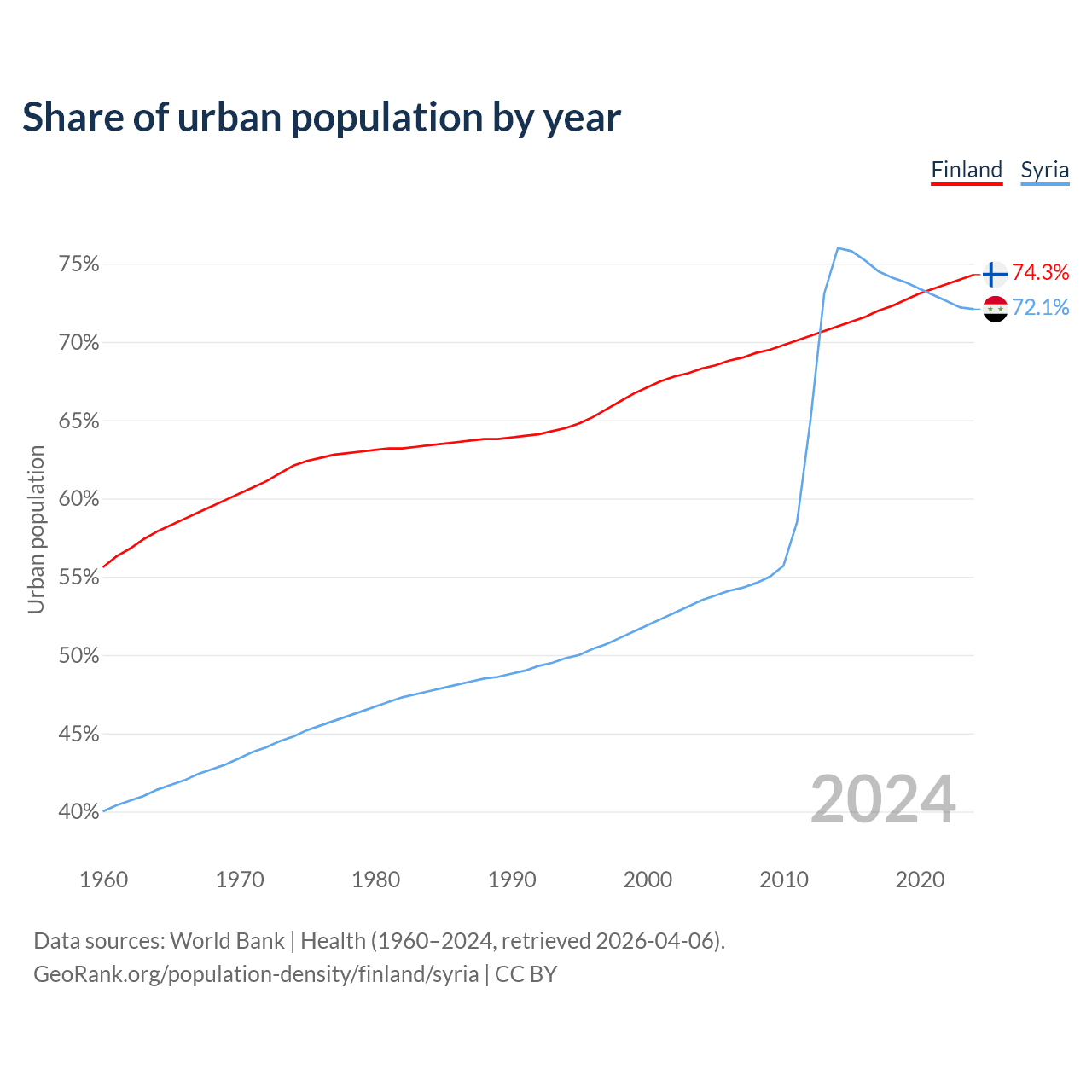 From 2004 to 2024, the share of urban population changed from 68.3% to 74.3% in Finland and from 53.5% to 72.1% in Syria.