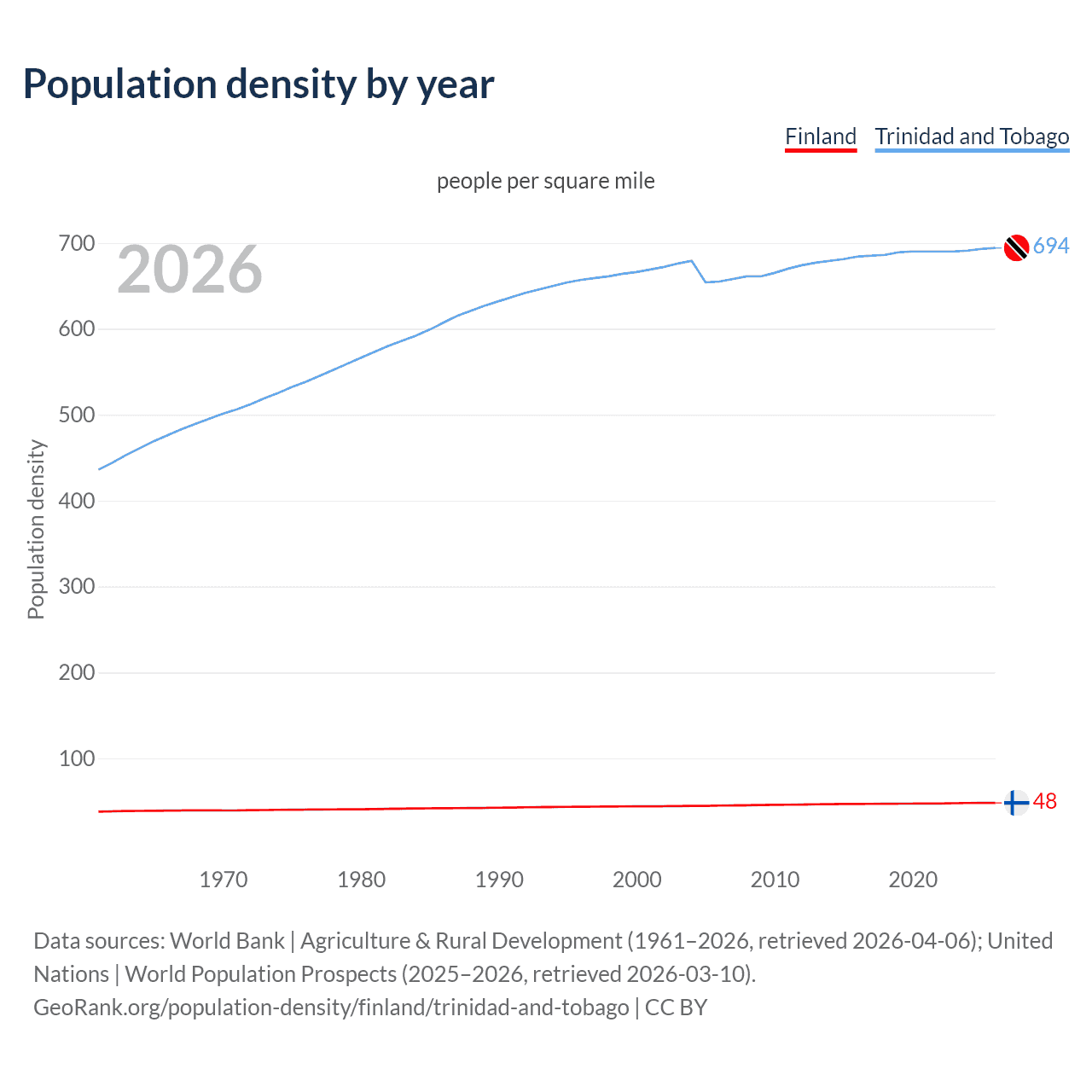 From 2006 to 2026, population density in Finland increased by 7%, compared to a 5.9% growth in Trinidad and Tobago.