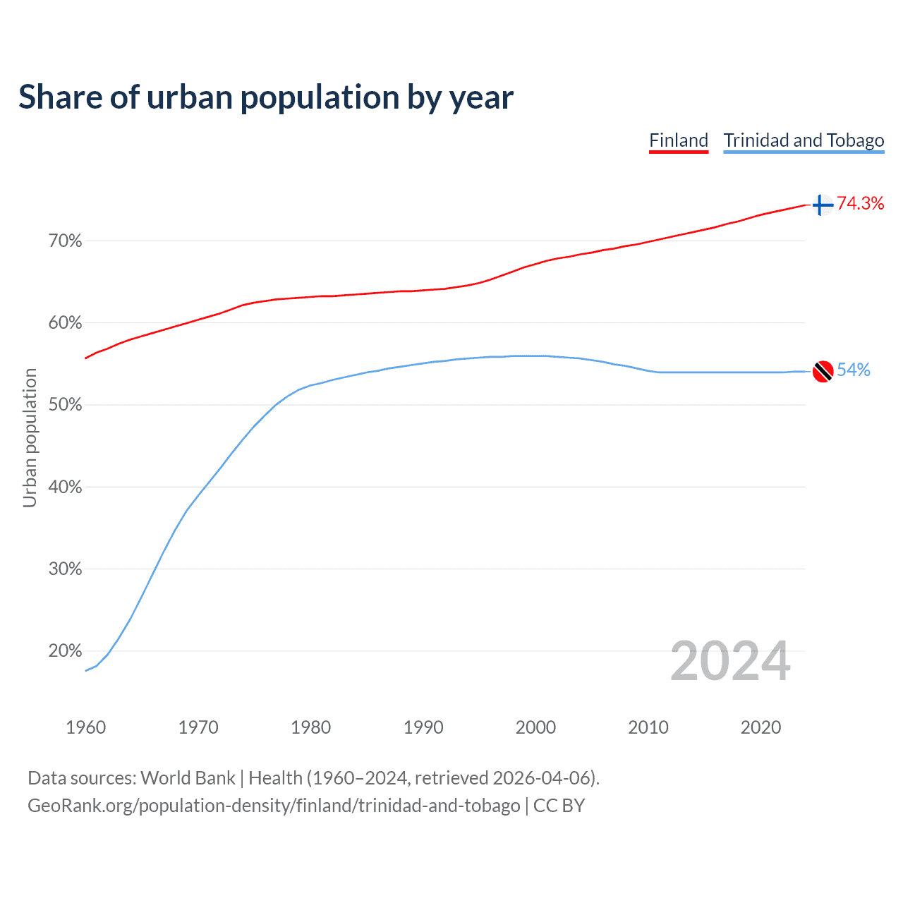 From 2004 to 2024, the share of urban population changed from 68.3% to 74.3% in Finland and from 55.6% to 54% in Trinidad and Tobago.