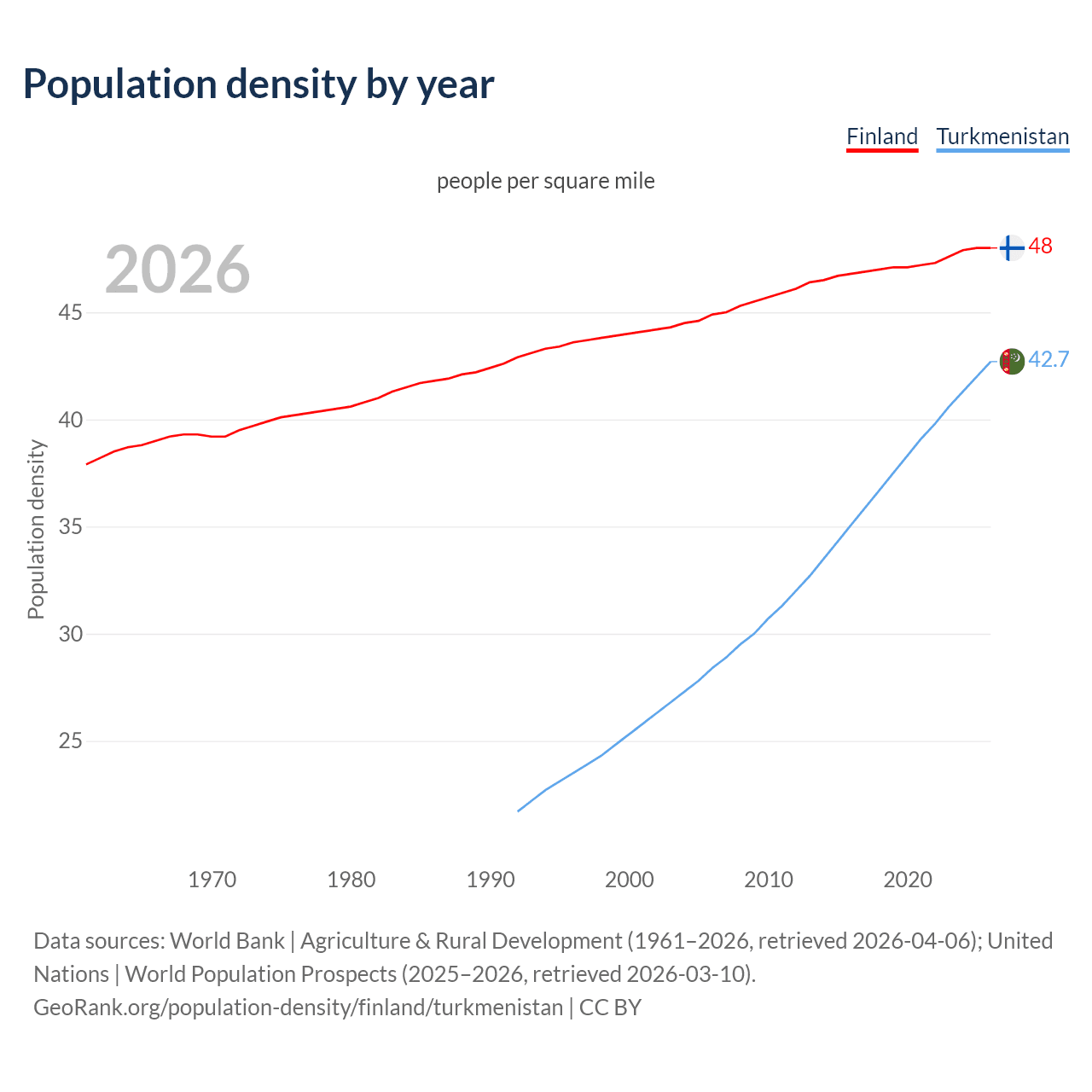 From 2006 to 2026, population density in Finland increased by 7%, compared to a 50.5% growth in Turkmenistan.