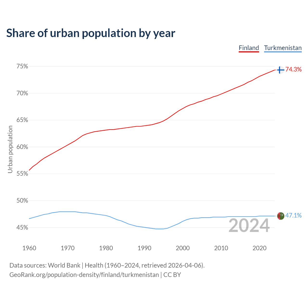 From 2004 to 2024, the share of urban population changed from 68.3% to 74.3% in Finland and from 46.7% to 47.1% in Turkmenistan.
