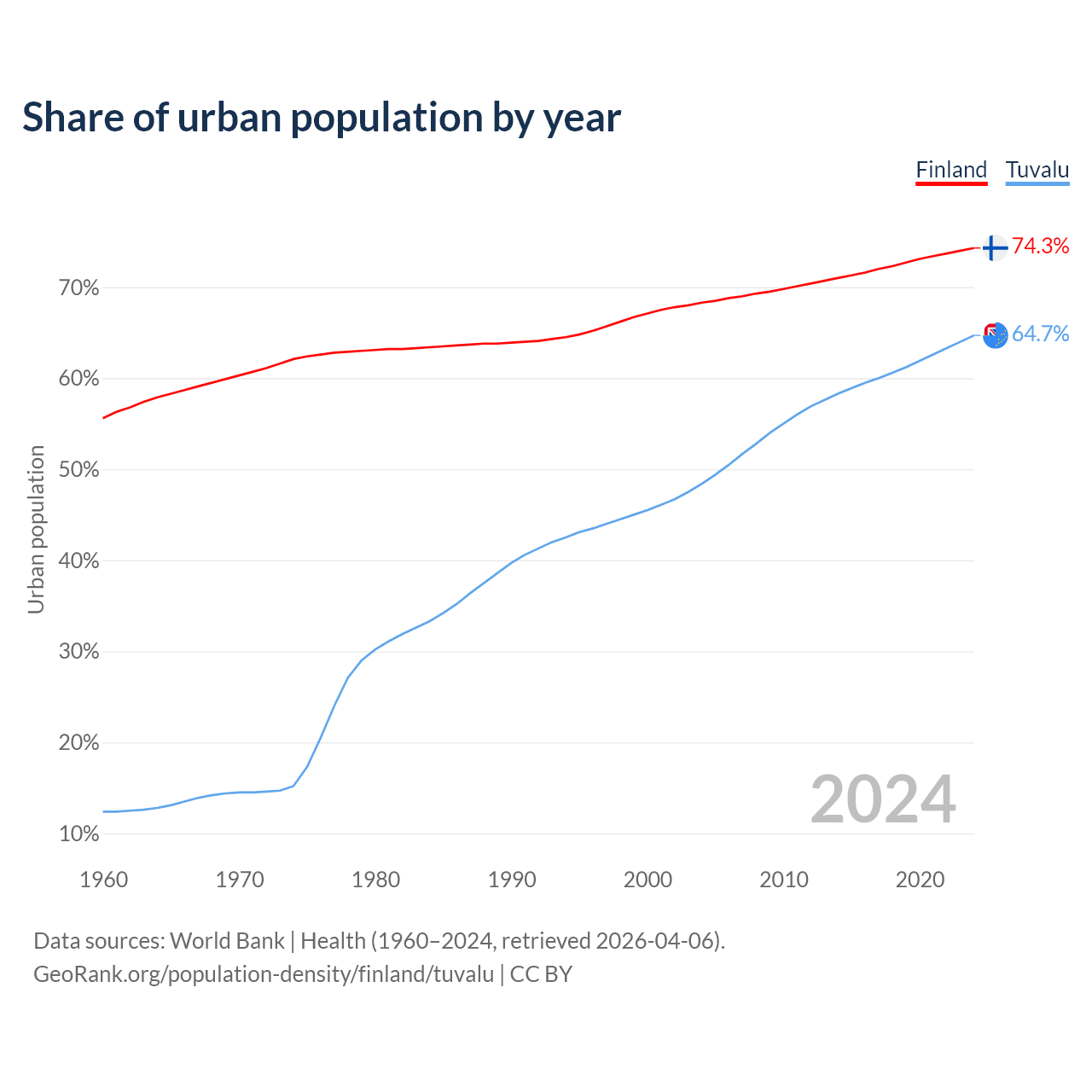 From 2004 to 2024, the share of urban population changed from 68.3% to 74.3% in Finland and from 48.4% to 64.7% in Tuvalu.