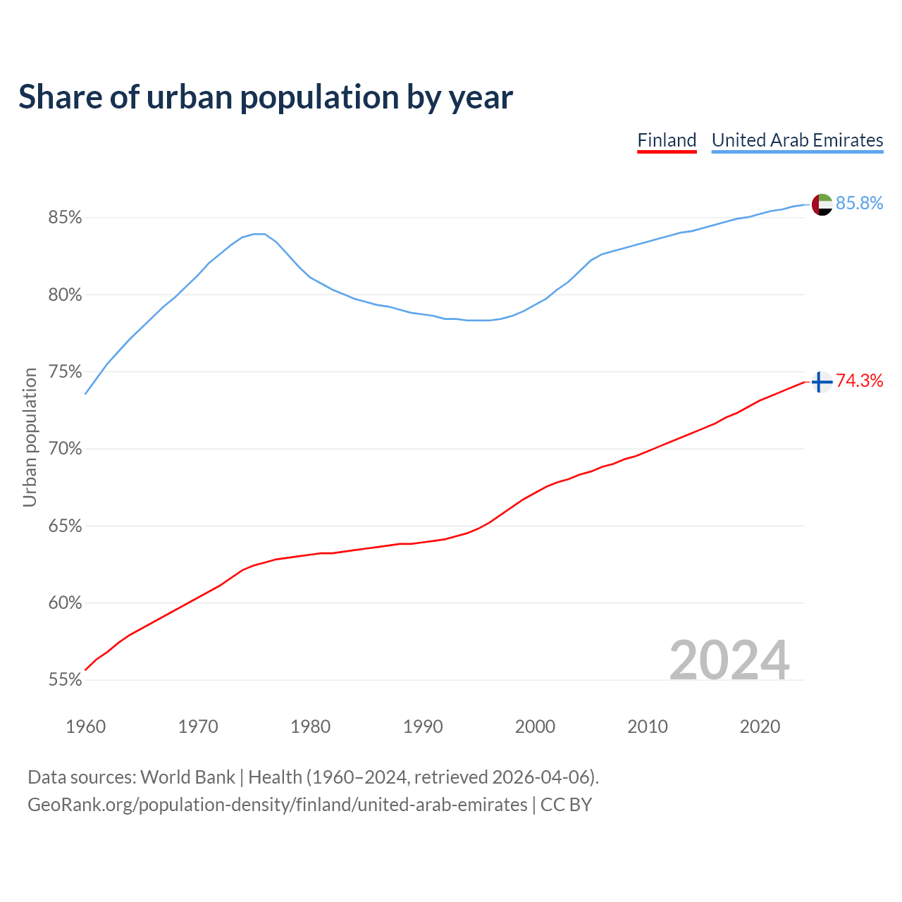 From 2004 to 2024, the share of urban population changed from 68.3% to 74.3% in Finland and from 81.5% to 85.8% in the United Arab Emirates.