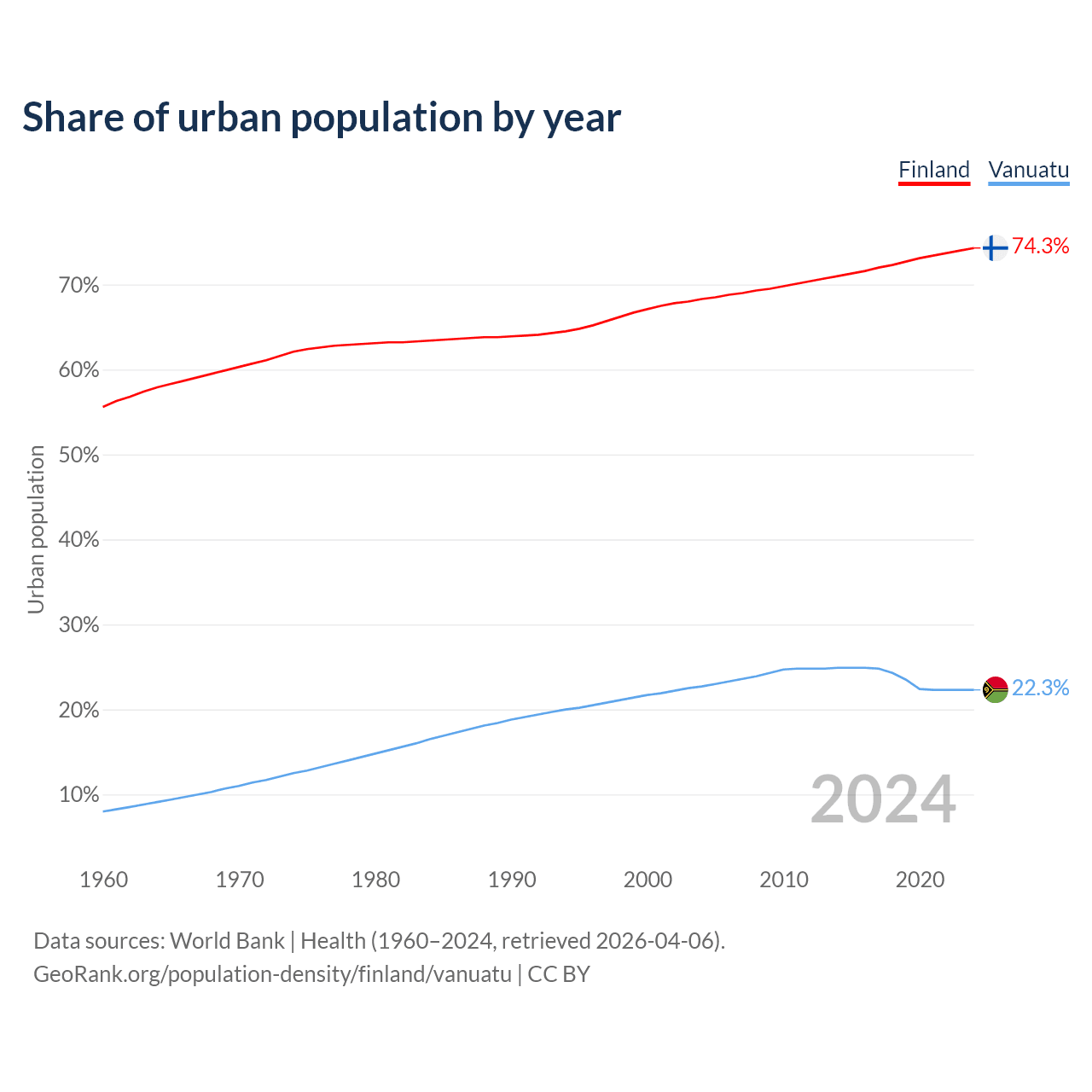 From 2004 to 2024, the share of urban population changed from 68.3% to 74.3% in Finland and from 22.7% to 22.3% in Vanuatu.