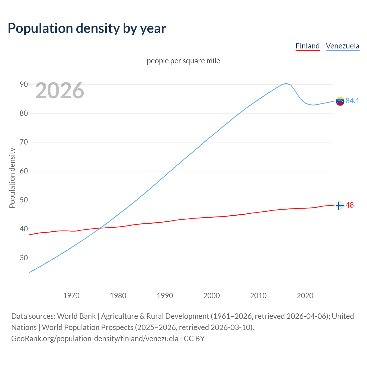 From 2006 to 2026, population density in Finland increased by 7%, compared to a 5.16% growth in Venezuela.