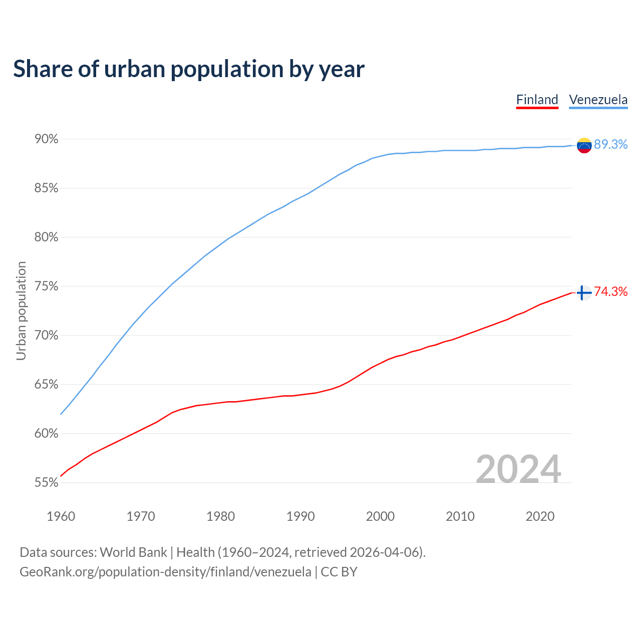 From 2004 to 2024, the share of urban population changed from 68.3% to 74.3% in Finland and from 88.6% to 89.3% in Venezuela.