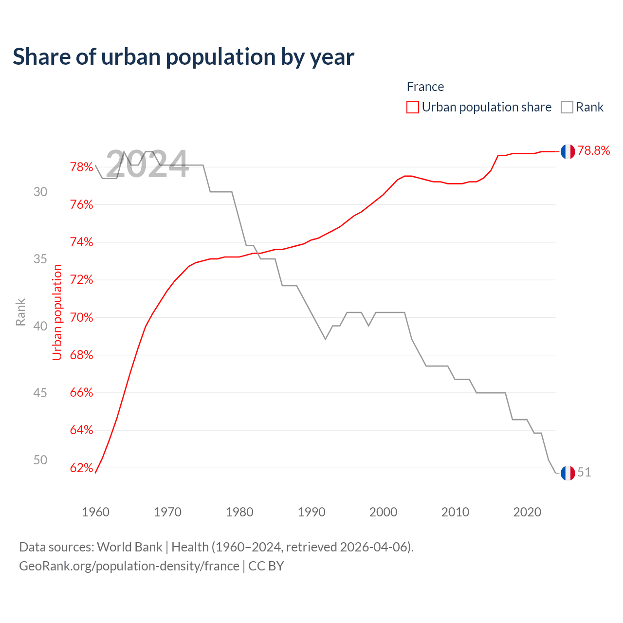 This chart shows the share of urban population in France from 1960 to 2024: 61.7% lived in urban areas in 1960, 76.5% in 2000, and 78.8% in 2024.