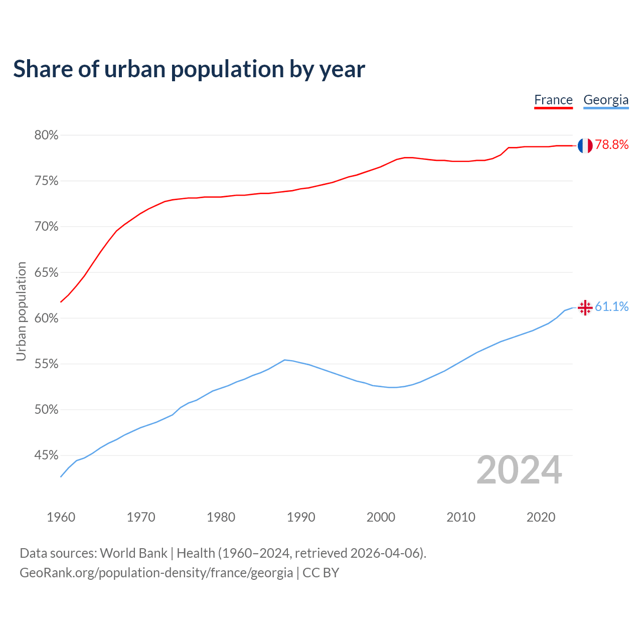 From 2004 to 2024, the share of urban population changed from 77.5% to 78.8% in France and from 52.7% to 61.1% in Georgia.