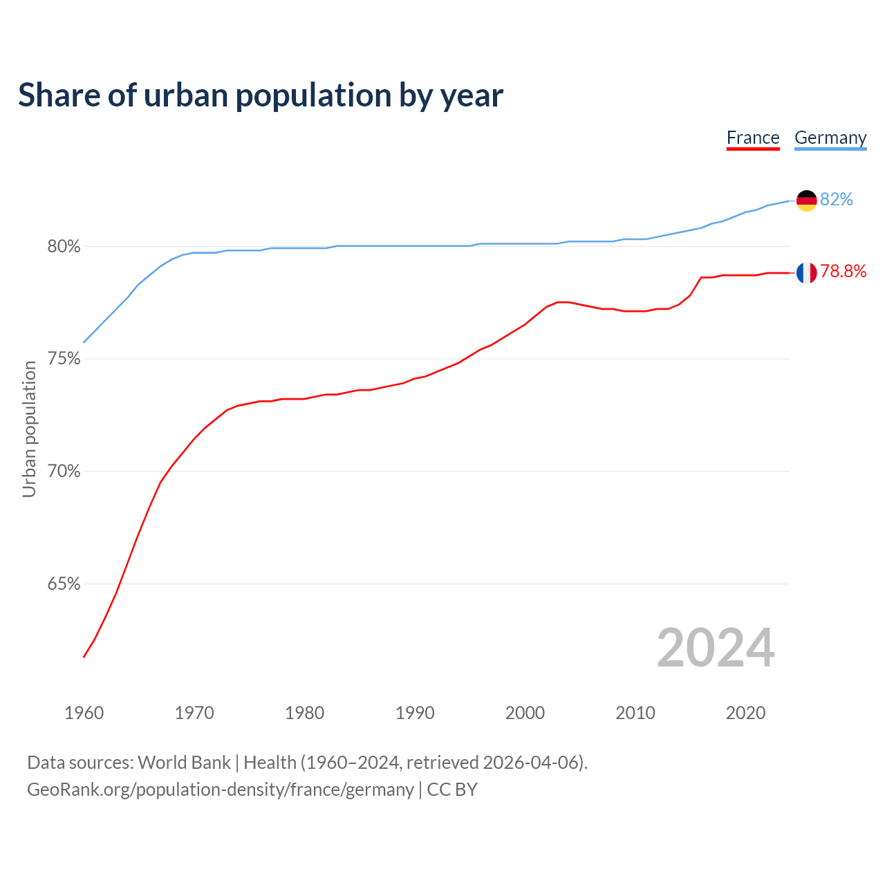 From 2004 to 2024, the share of urban population changed from 77.5% to 78.8% in France and from 80.2% to 82% in Germany.