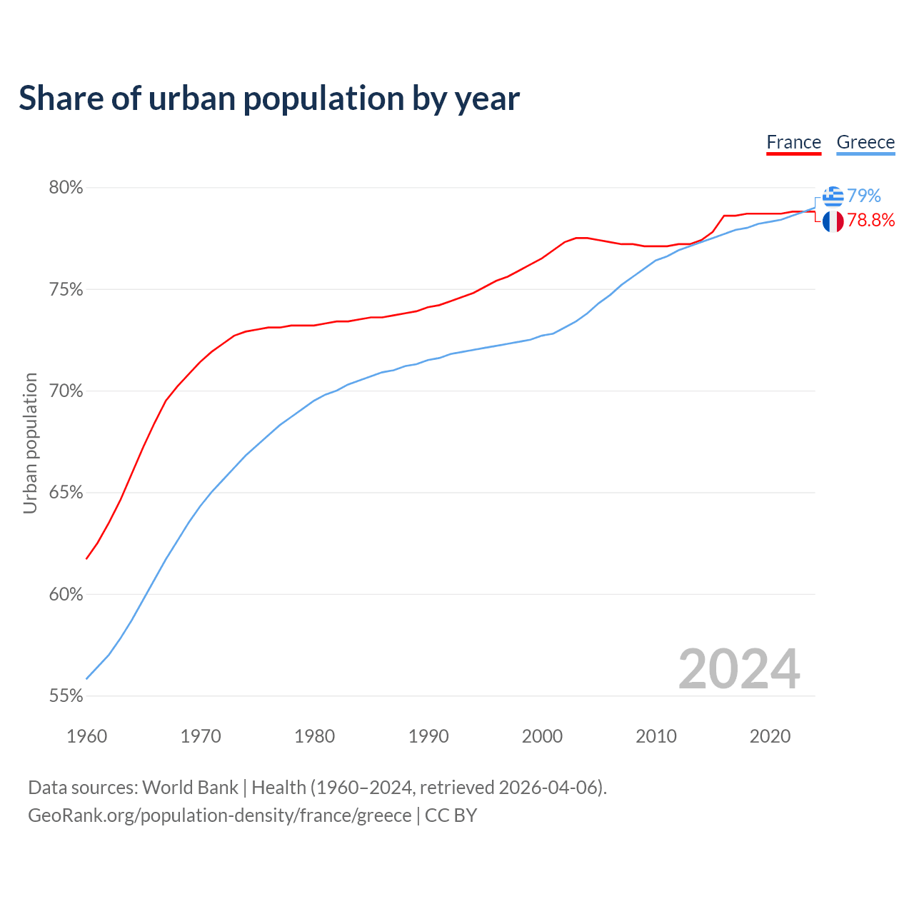 From 2004 to 2024, the share of urban population changed from 77.5% to 78.8% in France and from 73.8% to 79% in Greece.