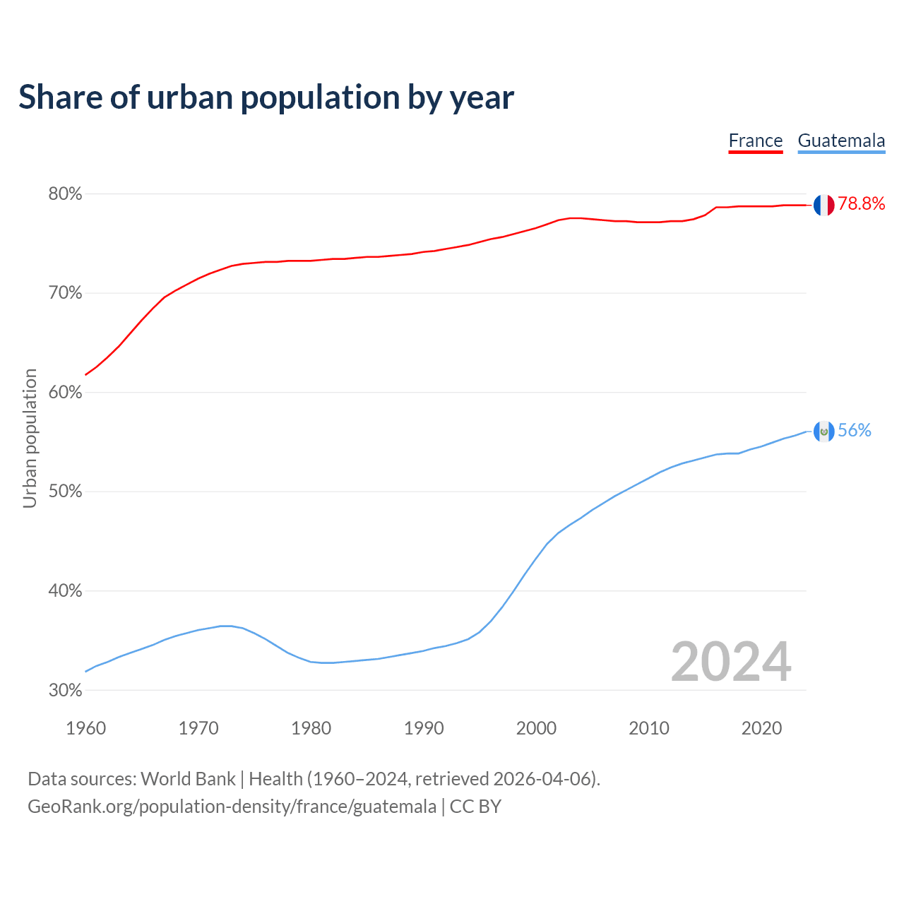 From 2004 to 2024, the share of urban population changed from 77.5% to 78.8% in France and from 47.3% to 56% in Guatemala.