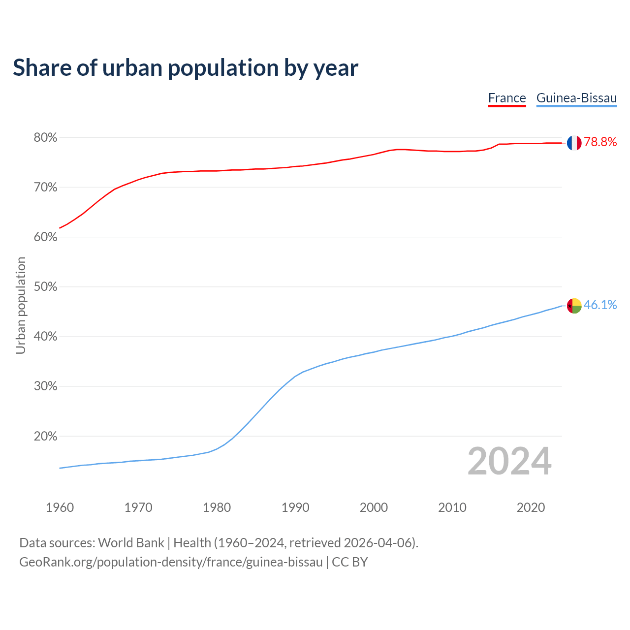 From 2004 to 2024, the share of urban population changed from 77.5% to 78.8% in France and from 38.1% to 46.1% in Guinea-Bissau.