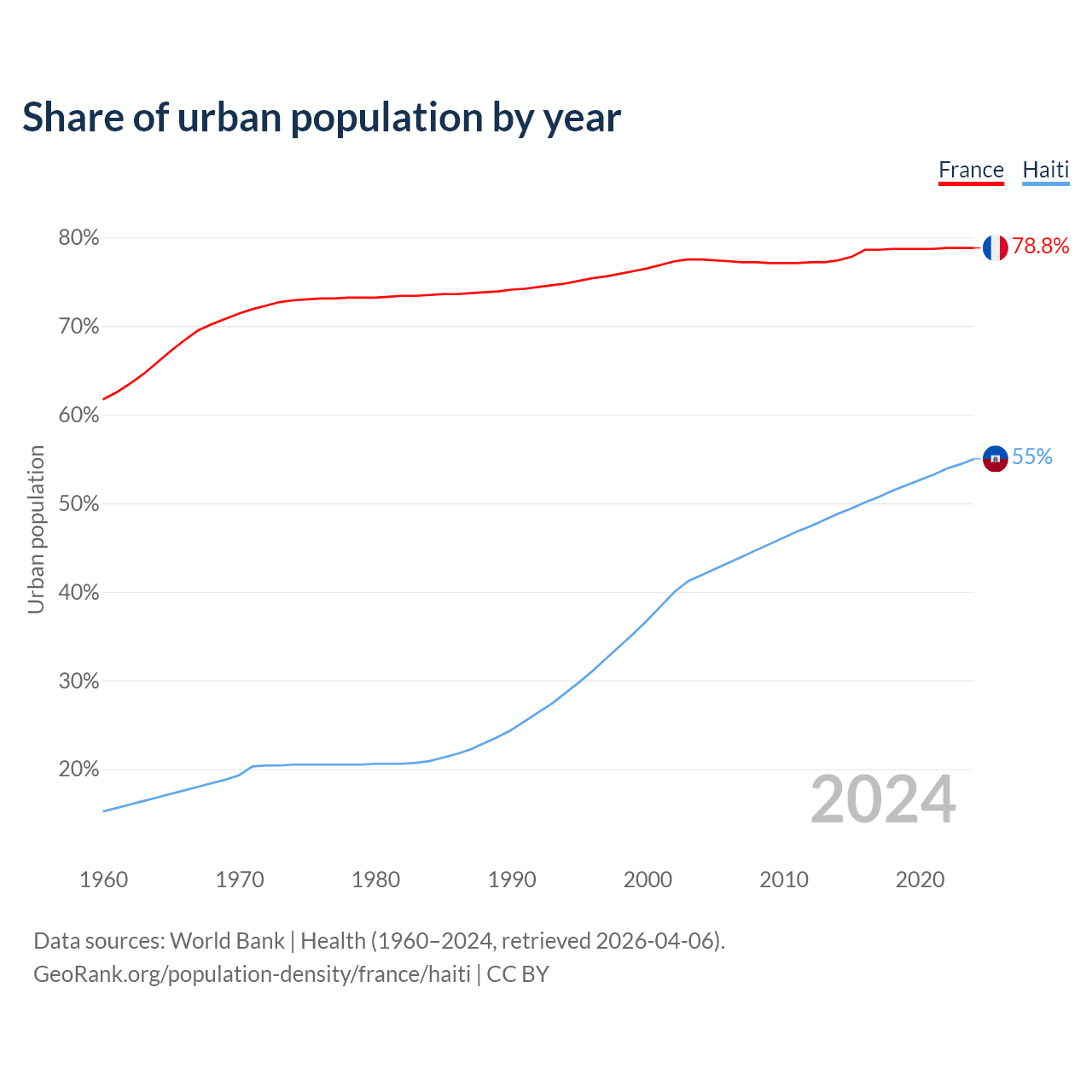 From 2004 to 2024, the share of urban population changed from 77.5% to 78.8% in France and from 41.9% to 55% in Haiti.