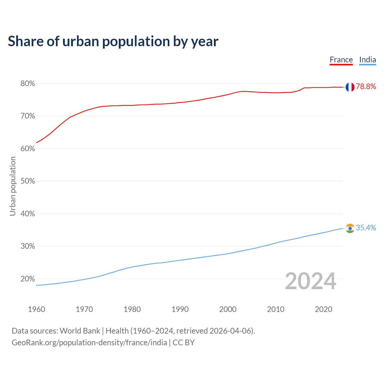From 2004 to 2024, the share of urban population changed from 77.5% to 78.8% in France and from 28.8% to 35.4% in India.