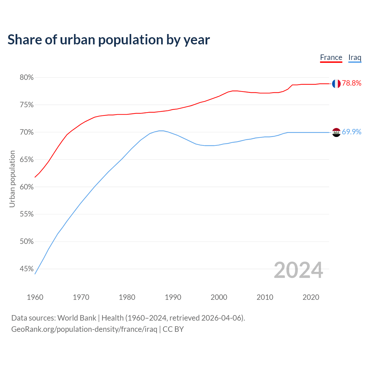 From 2004 to 2024, the share of urban population changed from 77.5% to 78.8% in France and from 68.2% to 69.9% in Iraq.
