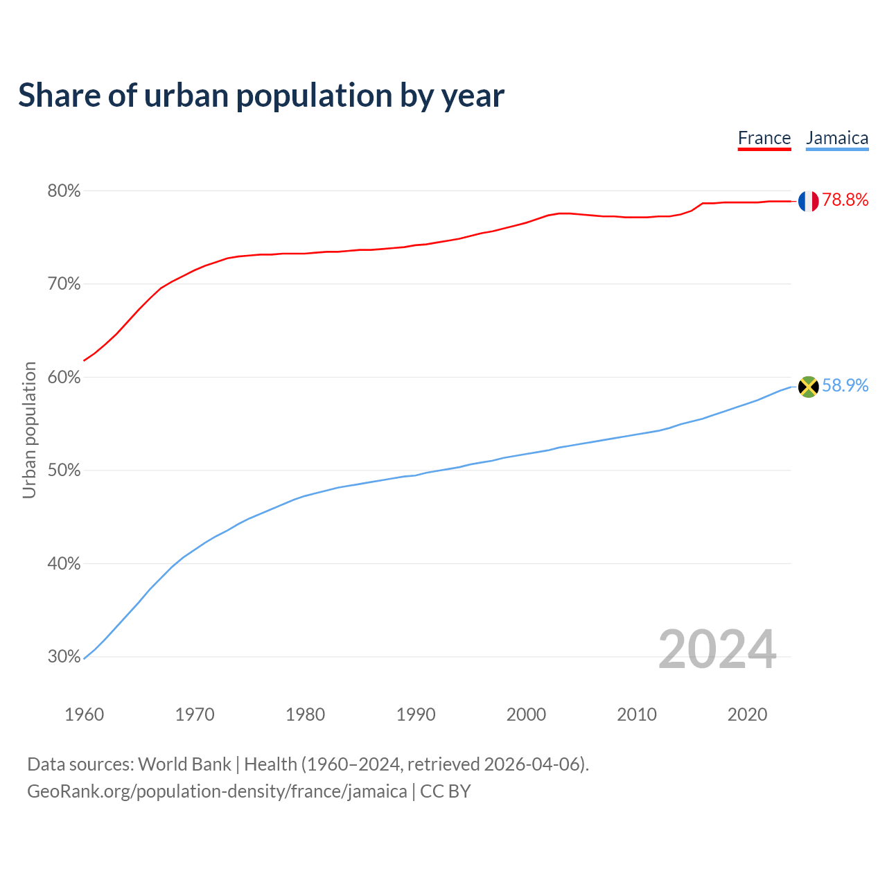 From 2004 to 2024, the share of urban population changed from 77.5% to 78.8% in France and from 52.6% to 58.9% in Jamaica.