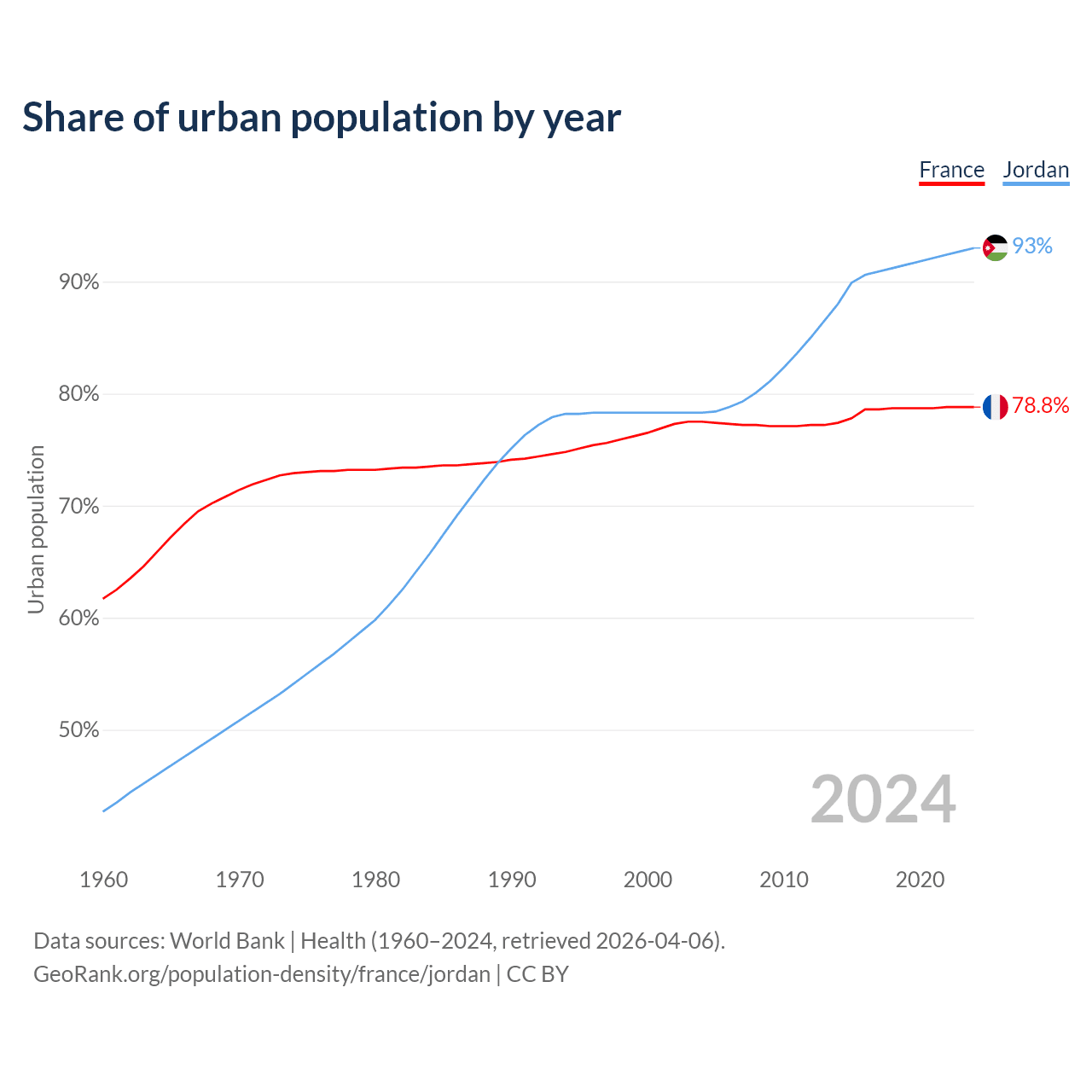 From 2004 to 2024, the share of urban population changed from 77.5% to 78.8% in France and from 78.3% to 93% in Jordan.