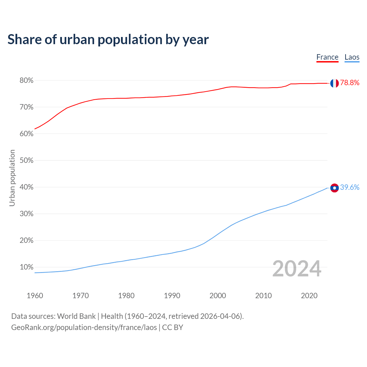 From 2004 to 2024, the share of urban population changed from 77.5% to 78.8% in France and from 26.5% to 39.6% in Laos.