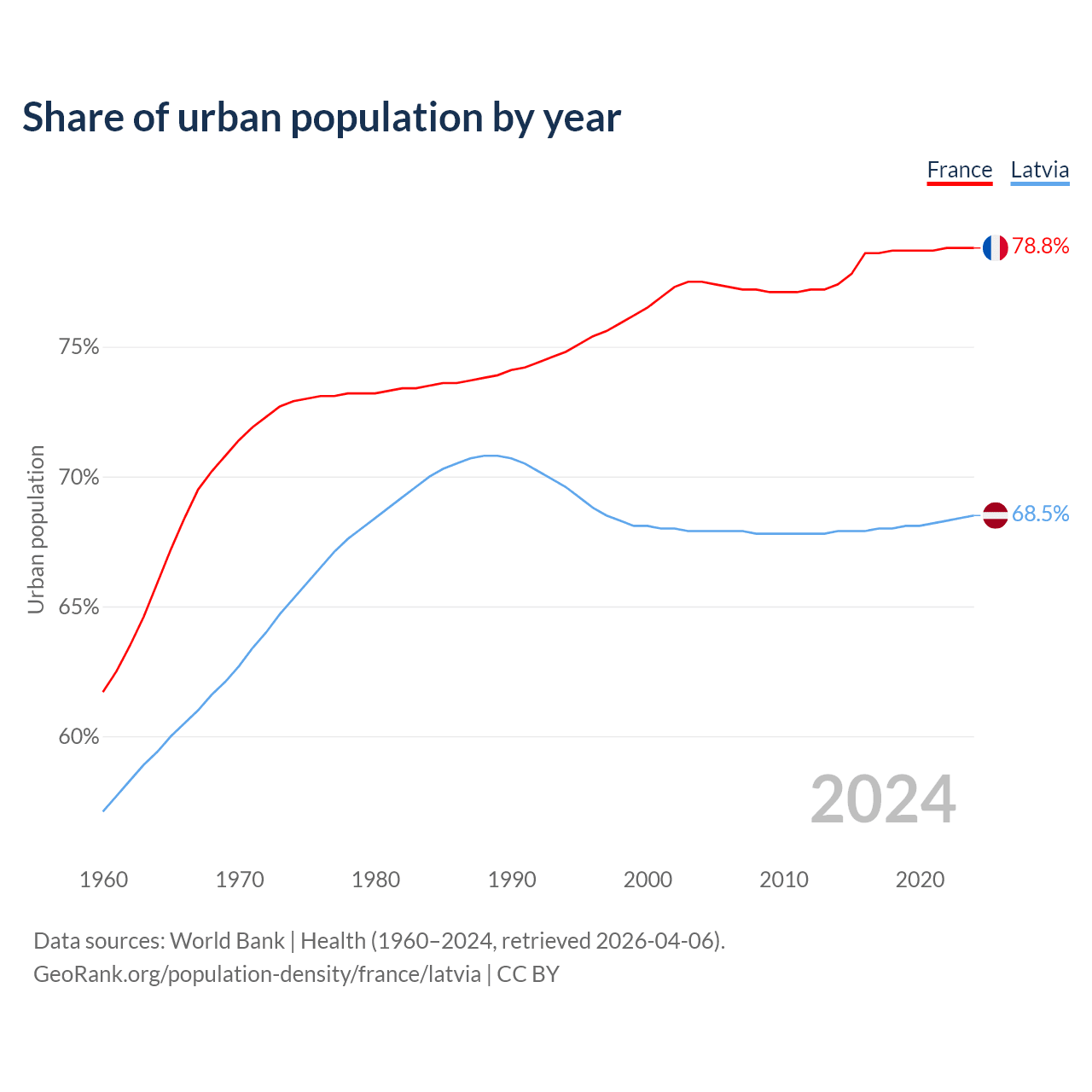 From 2004 to 2024, the share of urban population changed from 77.5% to 78.8% in France and from 67.9% to 68.5% in Latvia.