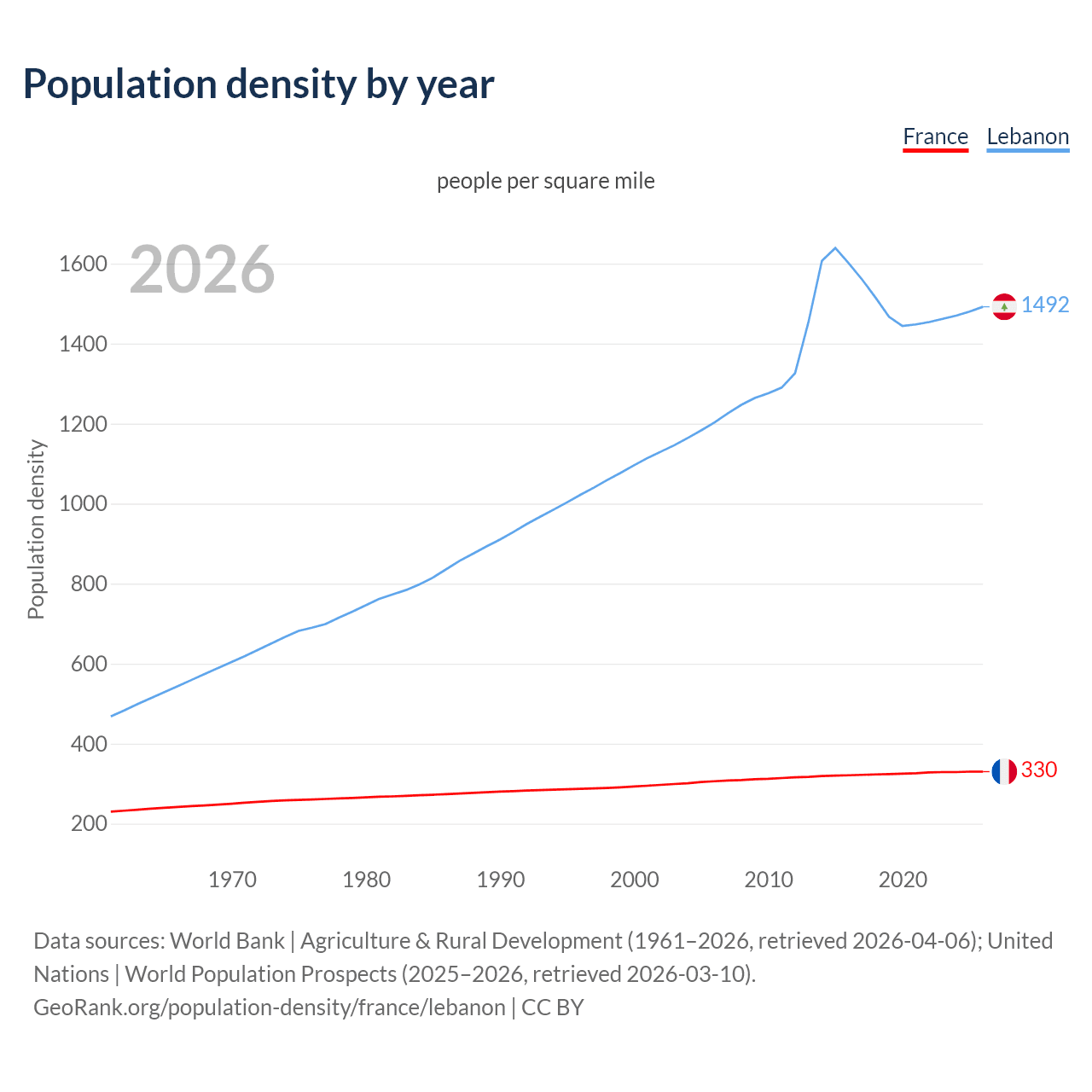 From 2006 to 2026, population density in France increased by 8.08%, compared to a 24% growth in Lebanon.