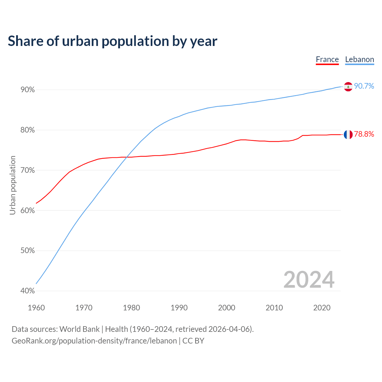 From 2004 to 2024, the share of urban population changed from 77.5% to 78.8% in France and from 86.6% to 90.7% in Lebanon.