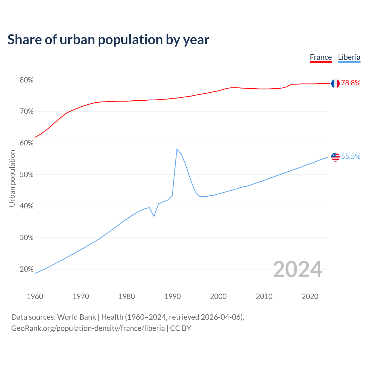 From 2004 to 2024, the share of urban population changed from 77.5% to 78.8% in France and from 45.4% to 55.5% in Liberia.