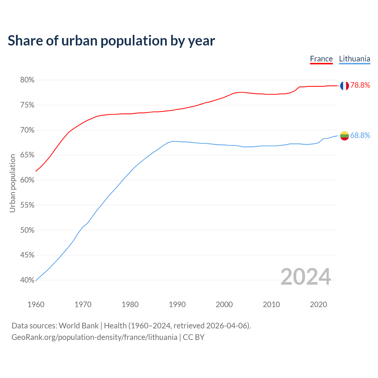 From 2004 to 2024, the share of urban population changed from 77.5% to 78.8% in France and from 66.6% to 68.8% in Lithuania.