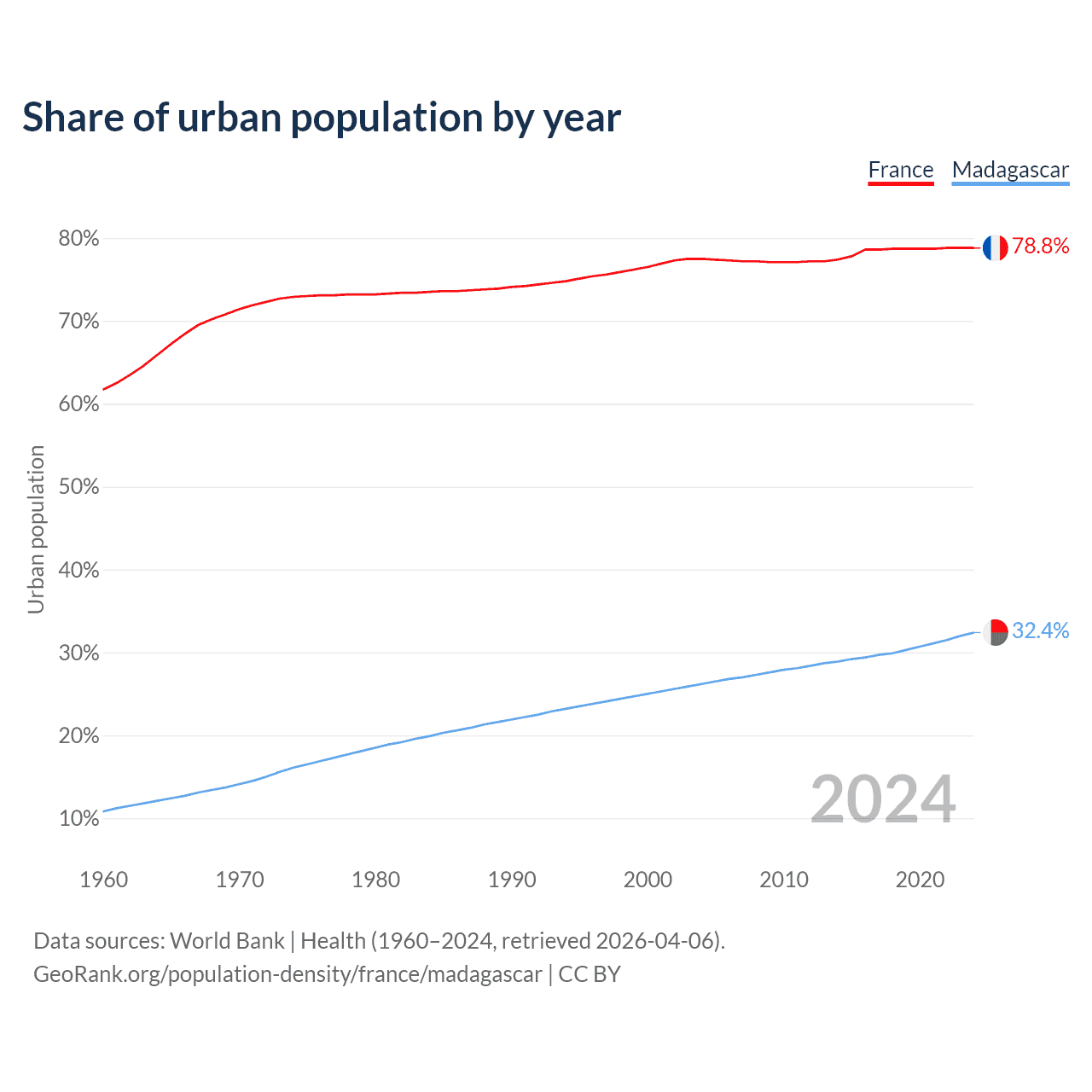 From 2004 to 2024, the share of urban population changed from 77.5% to 78.8% in France and from 26.2% to 32.4% in Madagascar.