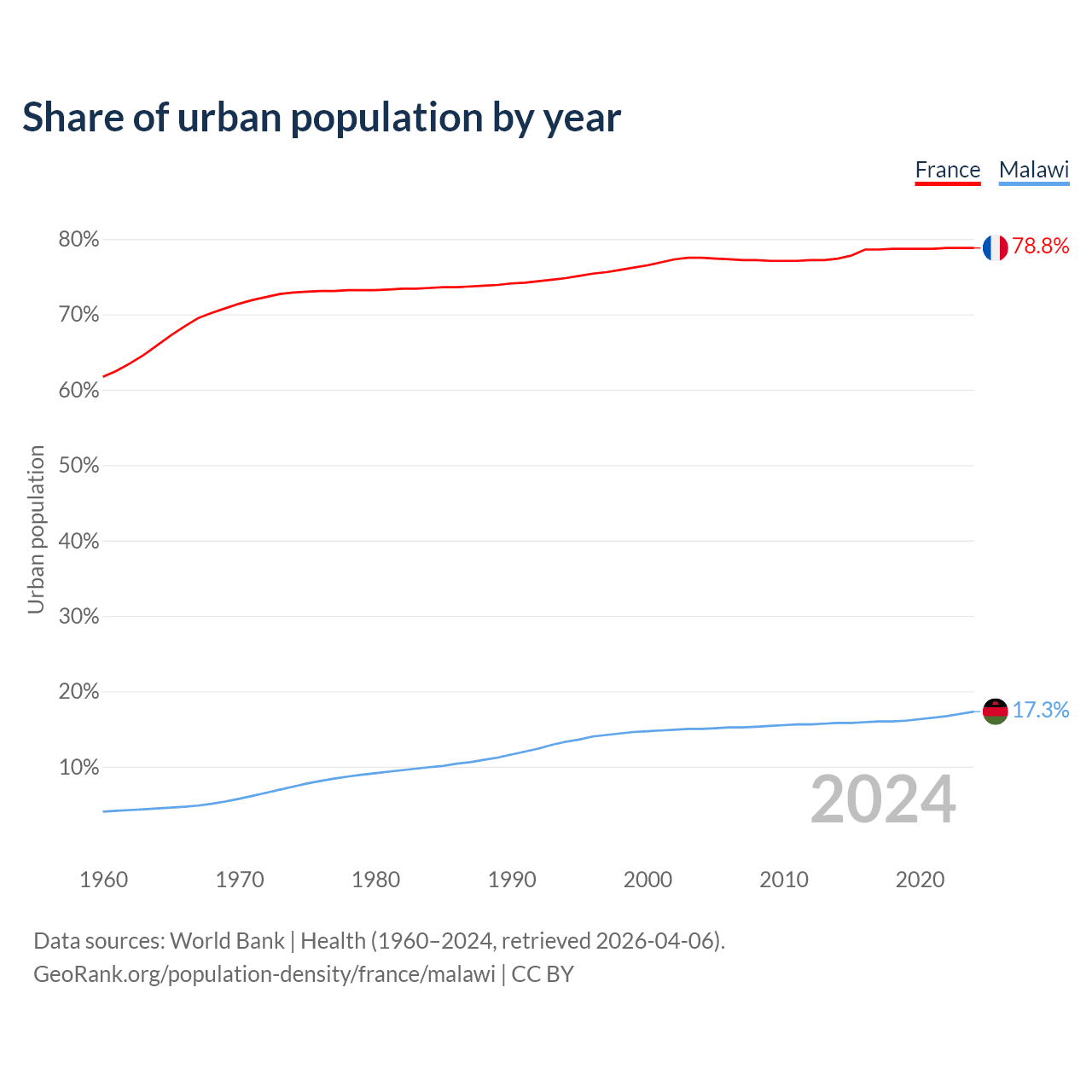 From 2004 to 2024, the share of urban population changed from 77.5% to 78.8% in France and from 15% to 17.3% in Malawi.