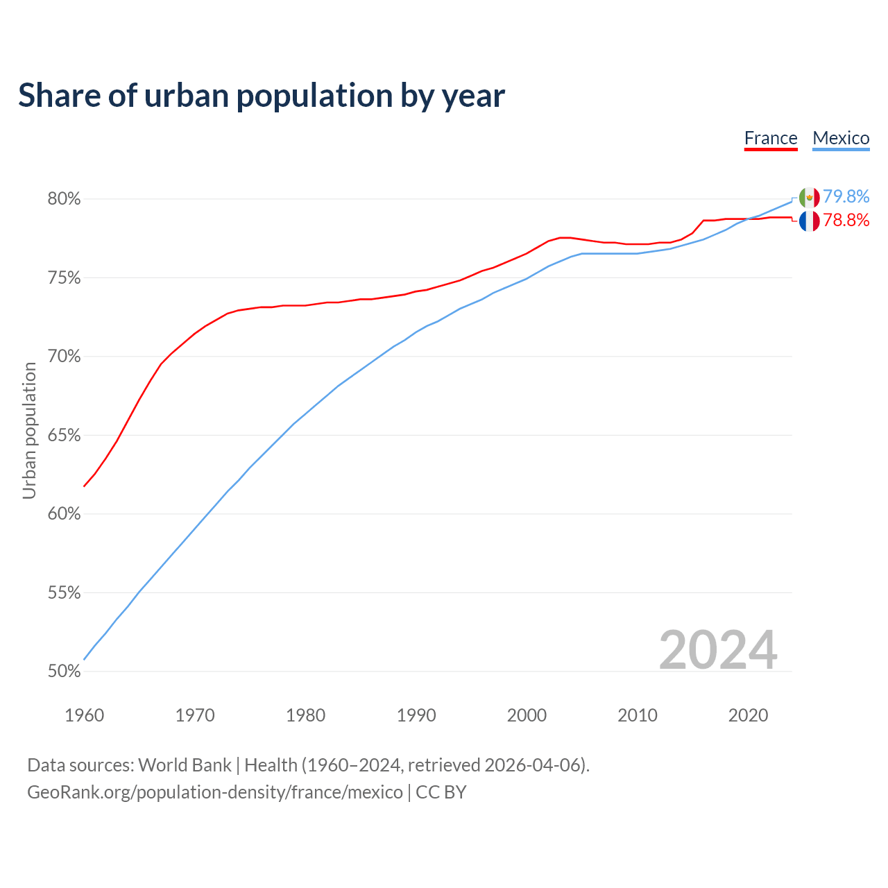 From 2004 to 2024, the share of urban population changed from 77.5% to 78.8% in France and from 76.3% to 79.8% in Mexico.